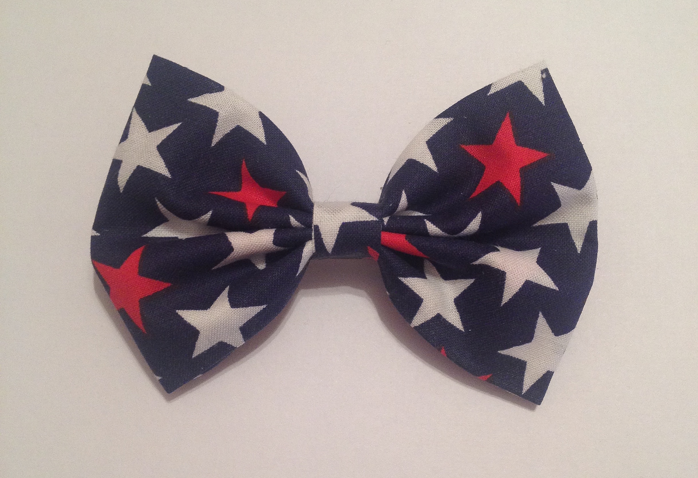 This bow is made from 100% cotton fabric and comes with an attached barrette. Bow is approximately 4 inches.